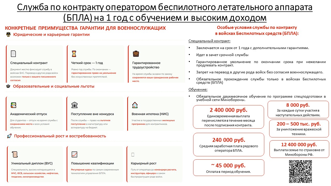 Условия службы по контракту оператором беспилотного летательного аппарата на 1 год с обучением и высоким доходом.