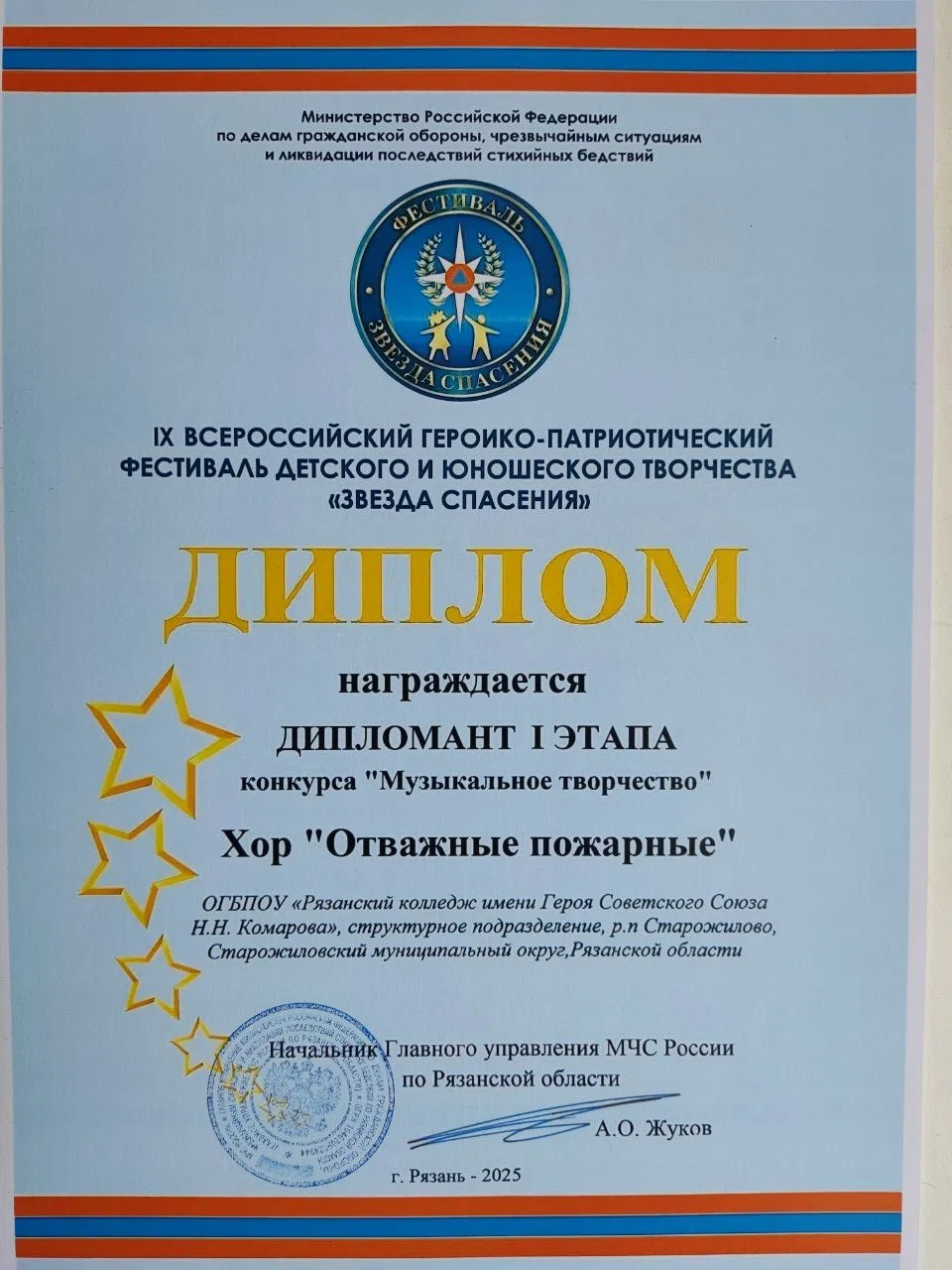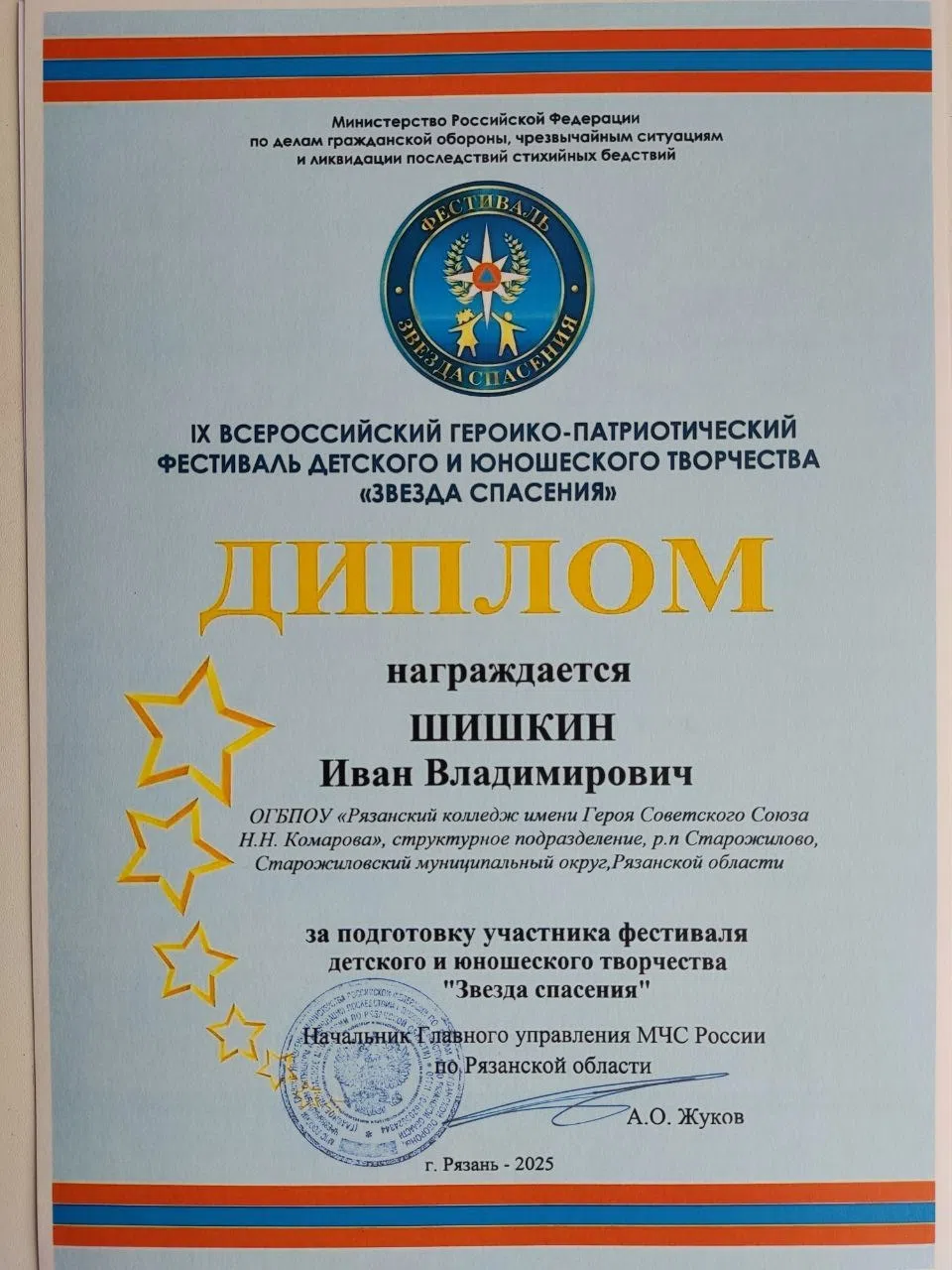 6 ноября 2025 года стали известны результаты IX Всероссийского героико-патриотического фестиваля детского и юношеского творчества «Звезда спасения», организованного Управлением МЧС России по Рязанской области. Студенты структурного подразделения ОГБПОУ «Рязанский колледж имени Героя Советского Союза Н.Н. Комарова» группы 1 «ПОЖ» под руководством куратора И.В.Шишкина заняли почетное III место в I этапе конкурса «Музыкальное творчество». Поздравляем!